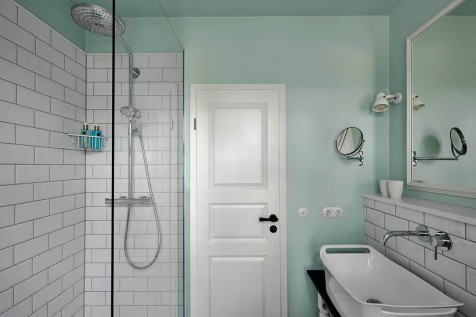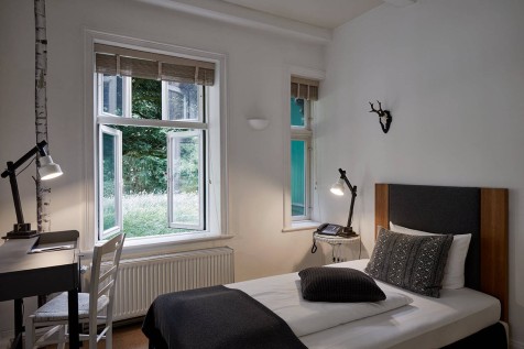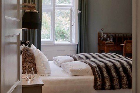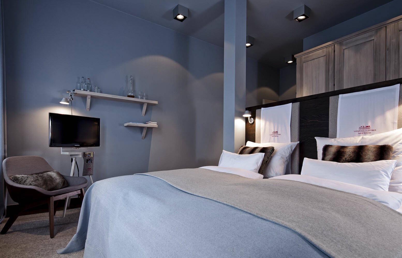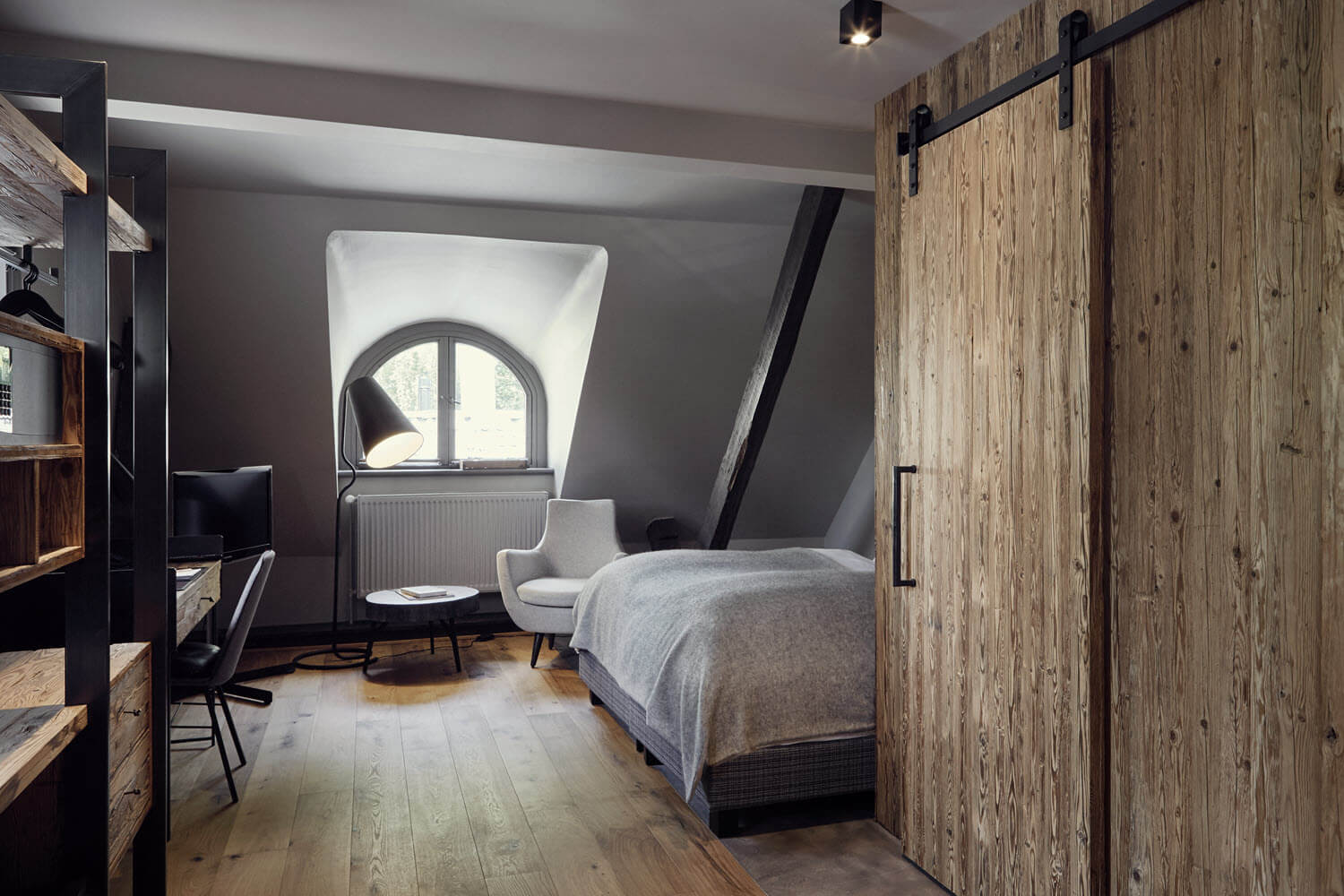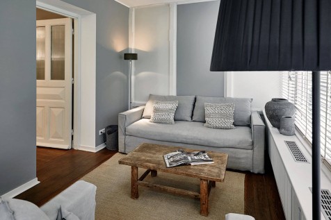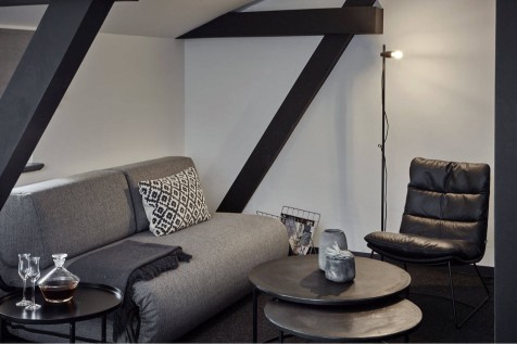 If you like it cozy & cool - a concrete look, with matt metal and dark beams across the ceiling, then you might want to pick one of our rooms in a puristic Skandi-Style.