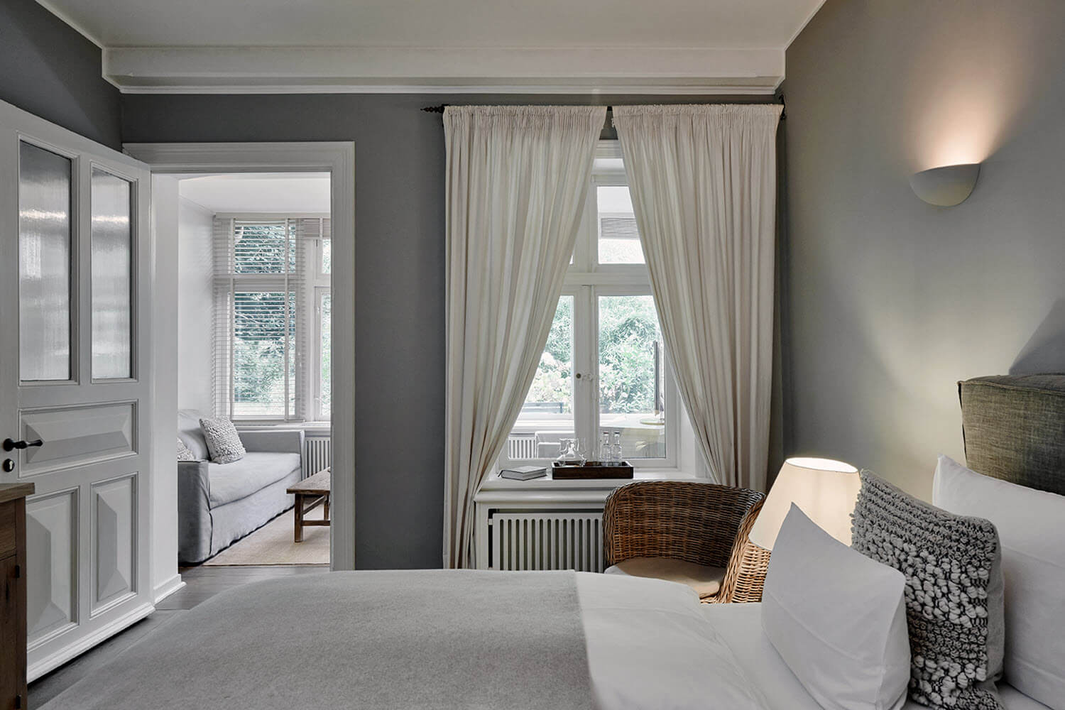 Last but not least: our suite with a beach house flair, a terrace and a conservatory. Snuggly fabrics in natural colours, loungy rattan furniture, hyggelig accessories – here, right in the middle of Hamburg, you will feel a little bit like in the Hamptons.
